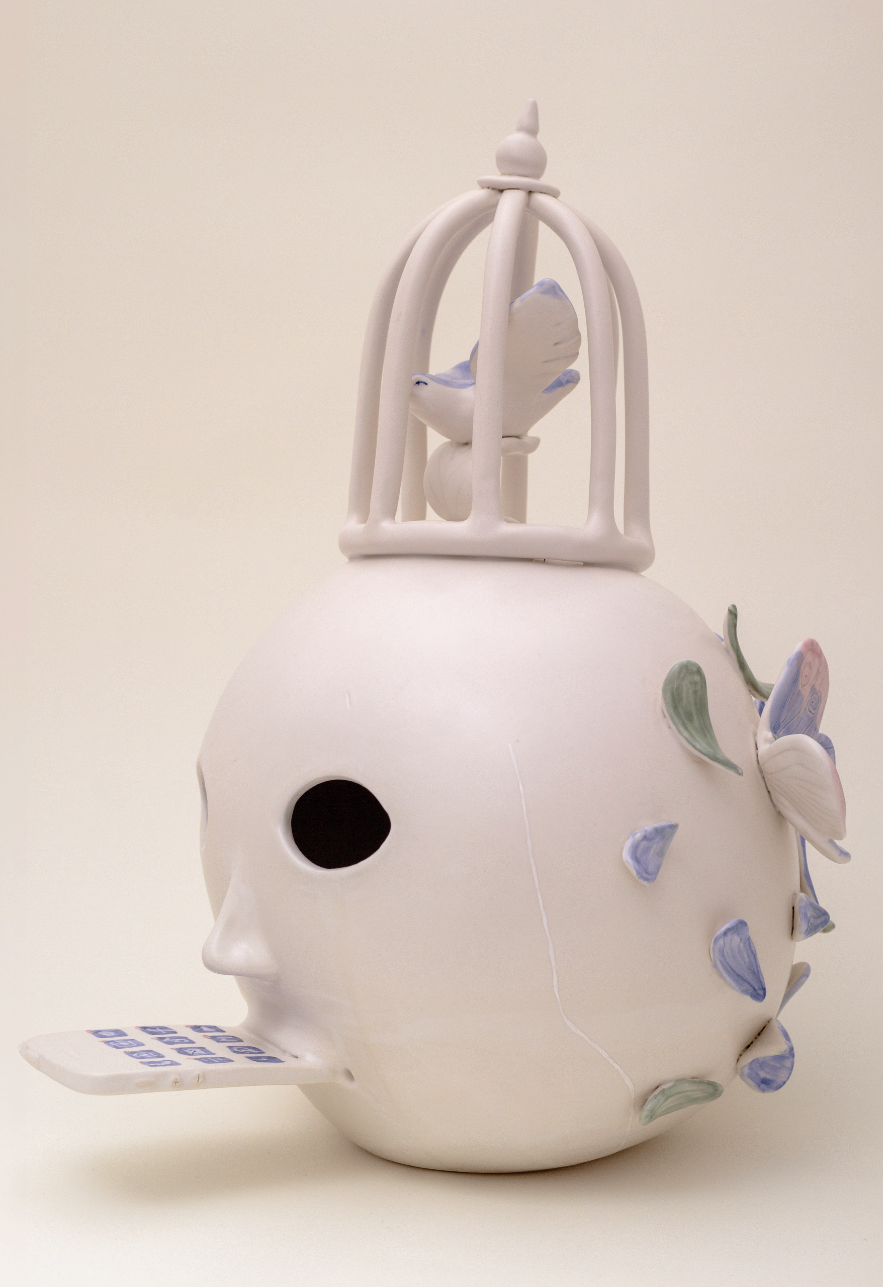 Just like Pieter Claesz a keen observer of the society he lived in “Update in Progress” offers a reflection on existence within the digital context. The work presents a large head with neutral features and a silent expression. This oversized head represents inflated egos those arrogant egos that cloud our perception constantly seeking external validation and prioritizing self-image over collective goals. In its mouth fitted like a prosthetic for speech is a mobile phone – an object that replaces real communication with a constant stream of stimuli. Atop the head a small cage traps a bird mid-flight a symbol of apparent but constrained freedom of a captive mind and silenced voices. Scattered across the sculpture are fallen leaves symbols of separation and detachment from reality and from what binds us. We lose sight of the fact that we are part of a whole. Unlike Claesz’s work where the butterfly appears subtly here it takes center stage. Resting on the right side of the head the butterfly reminds us of the ephemerality of all things. More than in the 17th century today it seems that nothing is made to last relationships materials values. The surface bears marks flaws small cracks scars. This disconnected life leaves behind subtle but deep perhaps irreparable traces. It weeps quietly. The hollow head devoid of inner mass suggests emptiness alienation and overload. Despite the constant stimuli inside we are often empty and barren. “Update in Progress” invites reflection on how technology shapes our thinking expression and presence. A head that no longer thinks but updates.